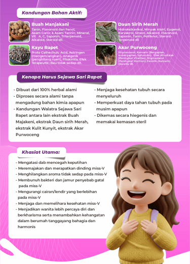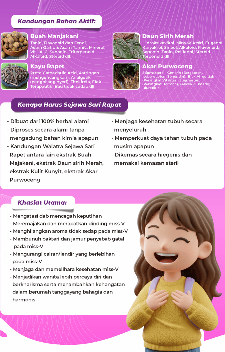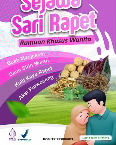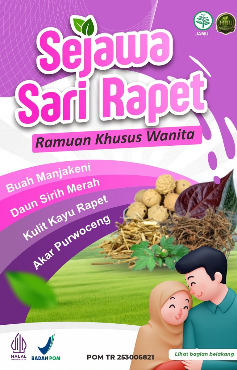 Sejawa Sari Rapet adalah ramuan herbal pilihan yang diracik dari kombinasi bahan alami premium seperti Buah Majakani, Daun Sirih Merah, Kulit Kayu Rapet, dan Akar Purwoceng. Formulanya dibuat untuk membantu menjaga kesehatan, kesegaran, dan kenyamanan area kewanitaan, sehingga Anda bisa tetap percaya diri dalam aktivitas sehari-hari.