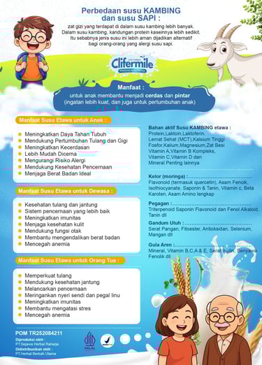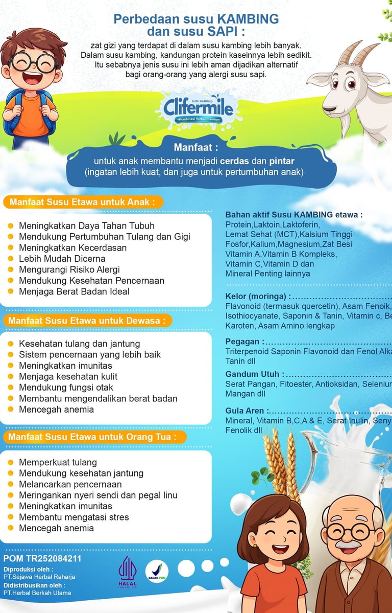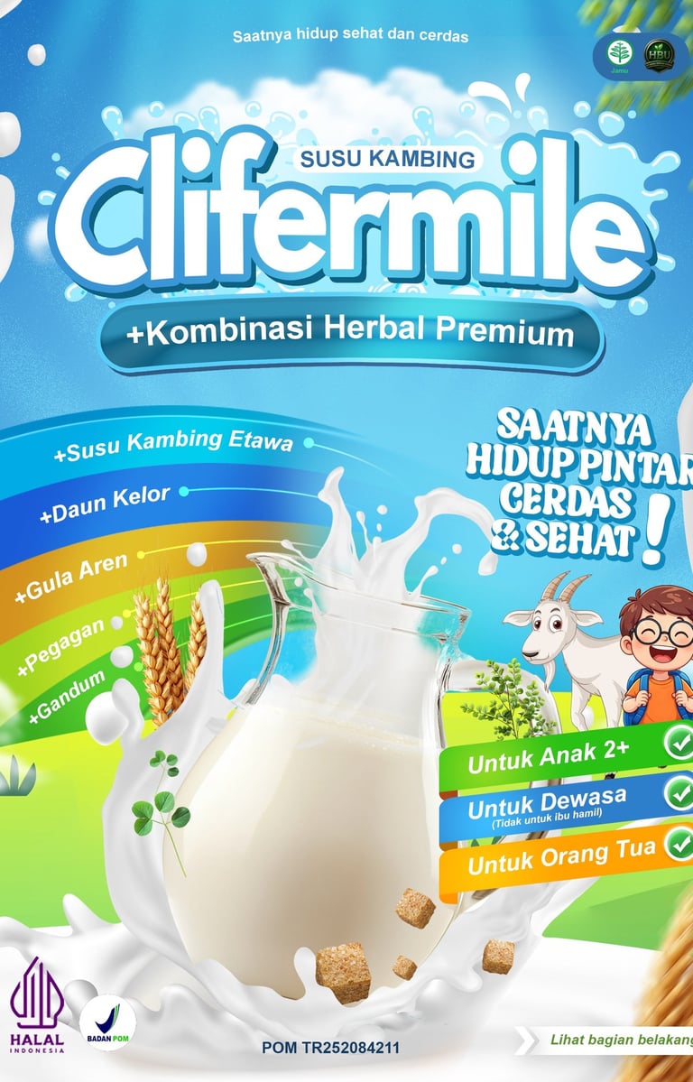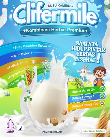 Clifermile adalah minuman herbal premium dengan kombinasi Susu Kambing Etawa, Daun Kelor, Gula Aren, Pegagan, dan Gandum. Diracik untuk membantu menjaga kebugaran, stamina, dan nutrisi harian dengan rasa yang nikmat dan praktis tinggal seduh.